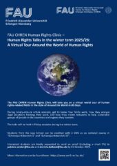 The Human Rights Talks is a project of the FAU CHREN Human Rights Clinic in the winter term 2025/26, which will take you on a virtual world tour of human rights related NGOs in the style of „Around the World in 80 Days“. Non-governmental organisations (NGOs) working in the field of human rights are independent, non-profit entities that operate at local, national, or international levels with the primary aim of promoting, protecting, and advancing human rights. They engage in activities such as monitoring and reporting abuses, advocating for legal and policy reforms, raising public awareness, providing support and protection to victims, and fostering compliance with international human rights standards. During ninety-minute online sessions, you will explore the world of NGOs and engage in discussions with experts from civil society practice in different world regions. Get to know how NGOs work, how they analyse legal situations framing their work and how they create networks to help vulnerable groups of people in the countries and regions they operate. The Human Rights Talks will give you an impression of the diverse human rights issues in the different regions of the world – they also represent an opportunity for global networking and finding out about what the world of defending human rights has to offer as a career perspective. The Talks will be held in Friday sessions during the winter term (Zoom or, in exceptional cases, in-person).
